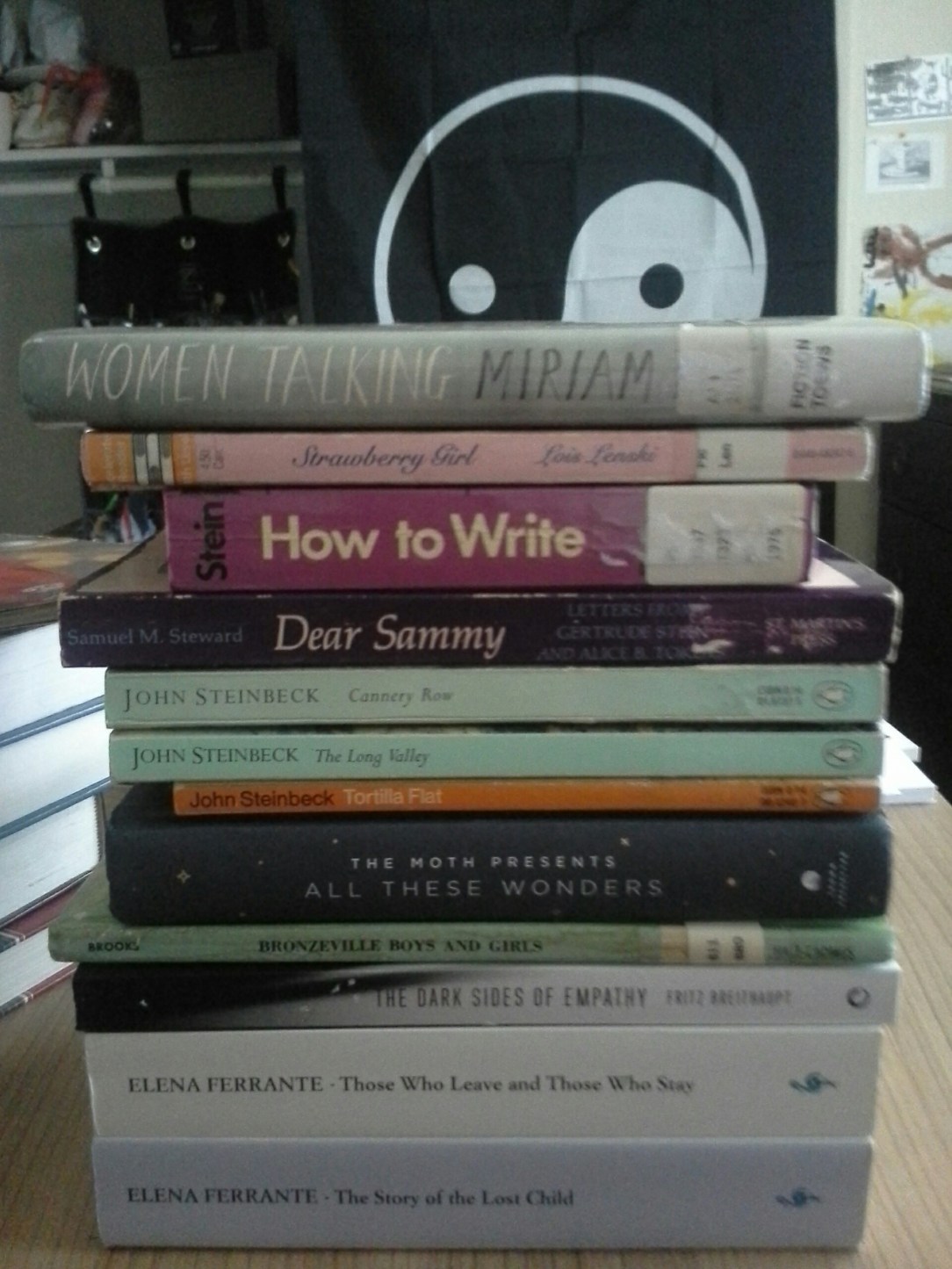 Here’s a stack of a solid dozen. Not sure where I’ll start or end, but isn’t that how it goes? I’m looking forward to a Steinbeck study, potentially finishing the second half of the Neapolitan novels and learning more about the dark sides of empathy. Miriam Toews is an author I have followed and enjoy– was happy to find there was something new of hers to read.