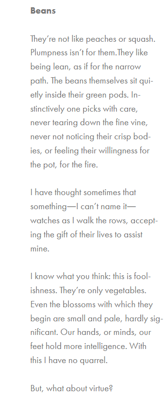 I made a beeline for the poetry section and felt the urge to take out every Mary Oliver book on the shelf, of which there were six. I’ve been reading and re-reading them over couple weeks. The poem “Beans” was discovered and felt worth sharing here.