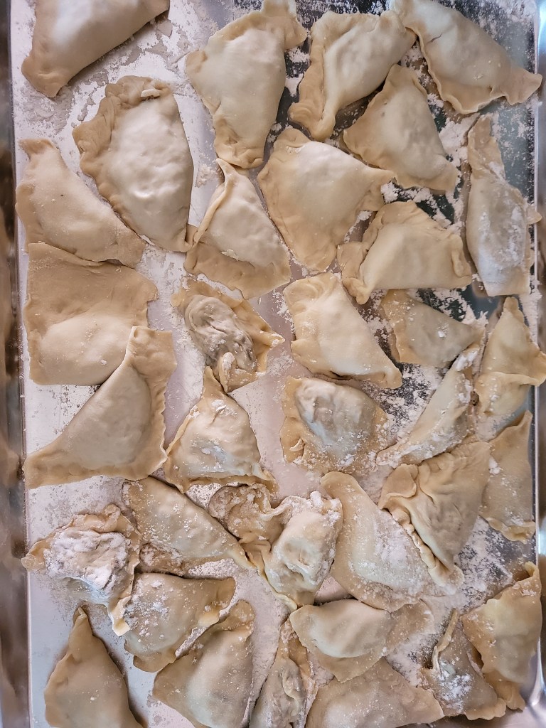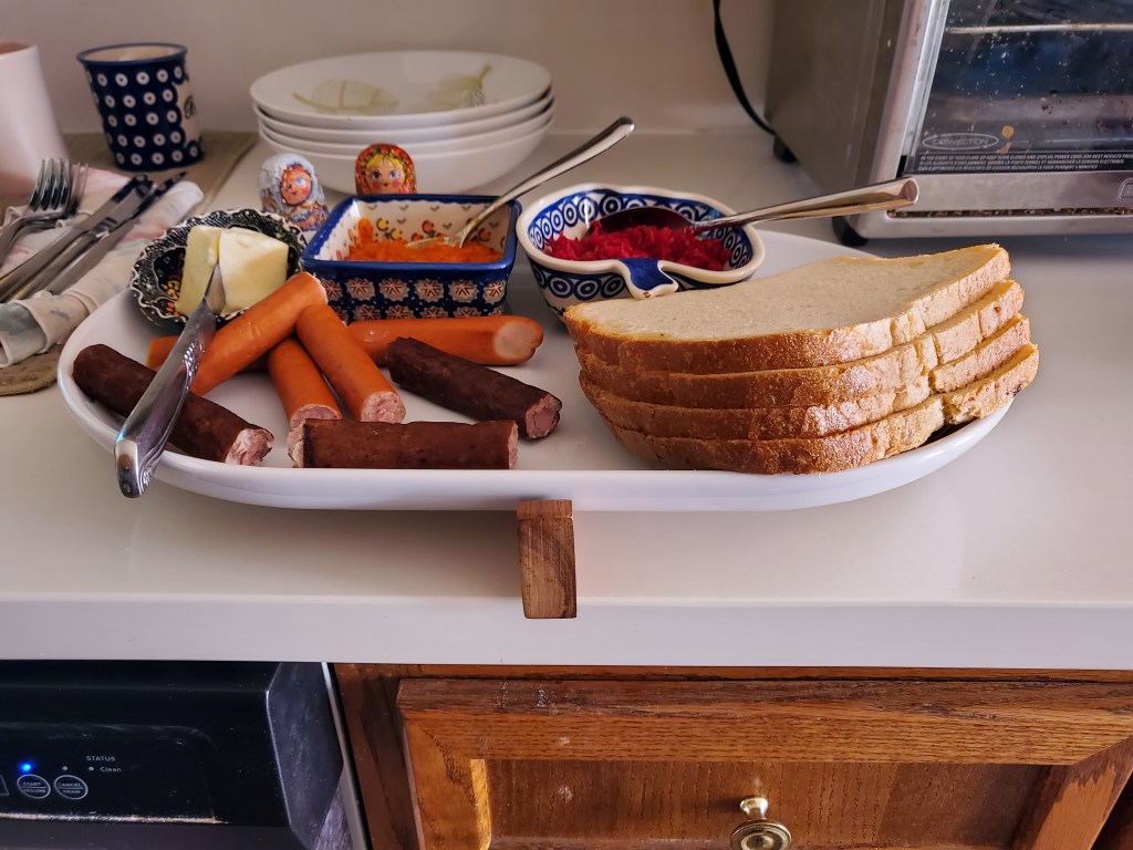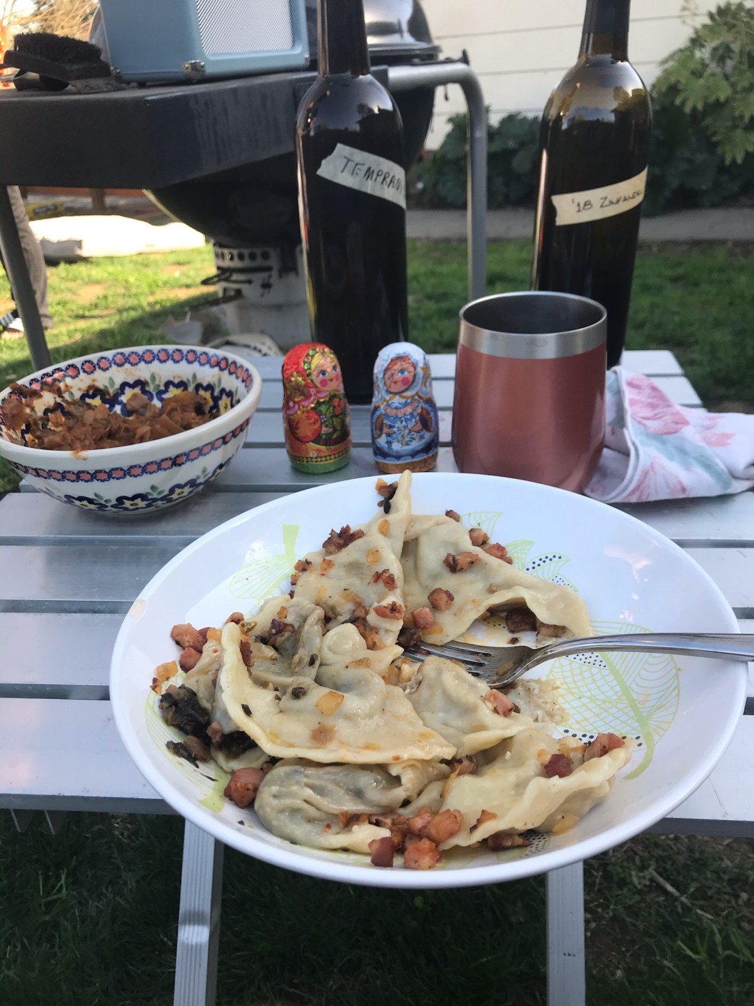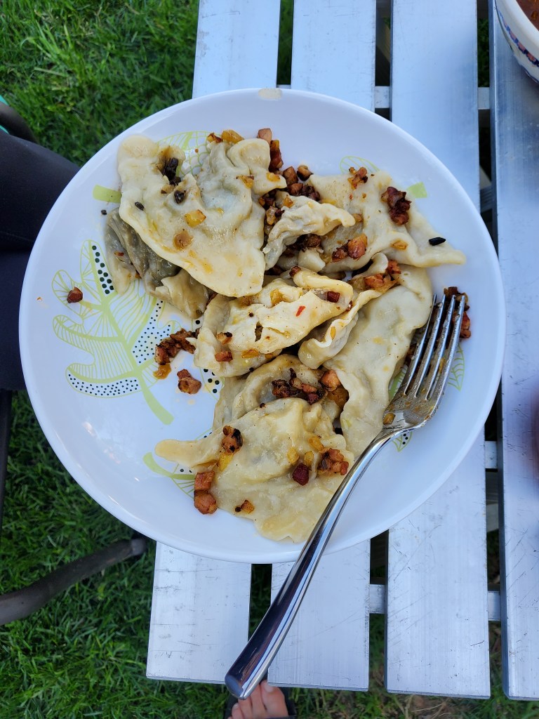 Now that we’re back to Open Arts I felt this meal was worth sharing. Kamil and I have a fantasy of creating a restaurant called smacznego, which in English translates to enjoy your meal. Bon appétit. Yesterday we served the tasting menu to some friends safely outside on a sunny Sunday. In recent iterations, I’ve even added on the polski sklep, which means Polish store, where you can buy ingredients to make bigos, which we served yesterday. Bigos is a dish that uses fermented cabbage, dried fruit, dried mushrooms, pork, kiełbasa, allspice, tomato paste, other magic. You’ll have to stop by the polski sklep to get the recipe. We made three kinds of pierogi, the fillings include: 1) ruski – potato, onion and white cheese, 2) kapustą i z grzybami – fermented cabbage and mushroom, 3) mięsem – meat. We had kiełbasa, sausage, accompanied with ćwikła, grated beets and horseradish, as well as ajvar, a spicy red pepper spread. We also served barszcz, which is a beet soup, strained such that you can drink it from a mug. Keeps you warm. We had some Russian cookies for dessert – we did not make them. It was a delicious Sunday! Homemade wine, too. Cheers to Open Arts!