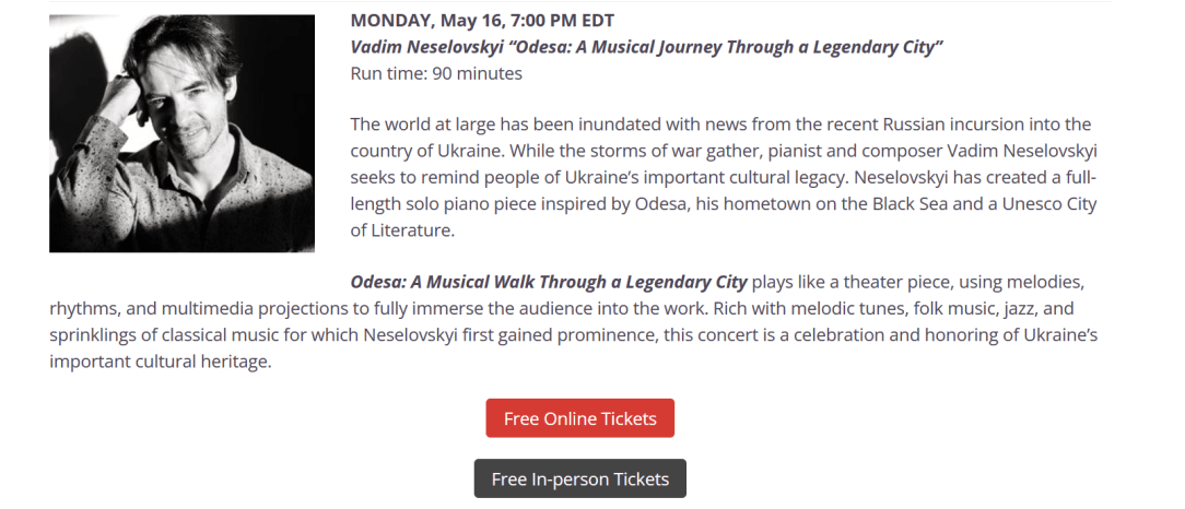 Odesa: A Musical Walk Through a Legendary City plays like a theater piece, using melodies, rhythms, and multimedia projections to fully immerse the audience into the work. This concert is a celebration and honoring of Ukraine’s important cultural heritage.