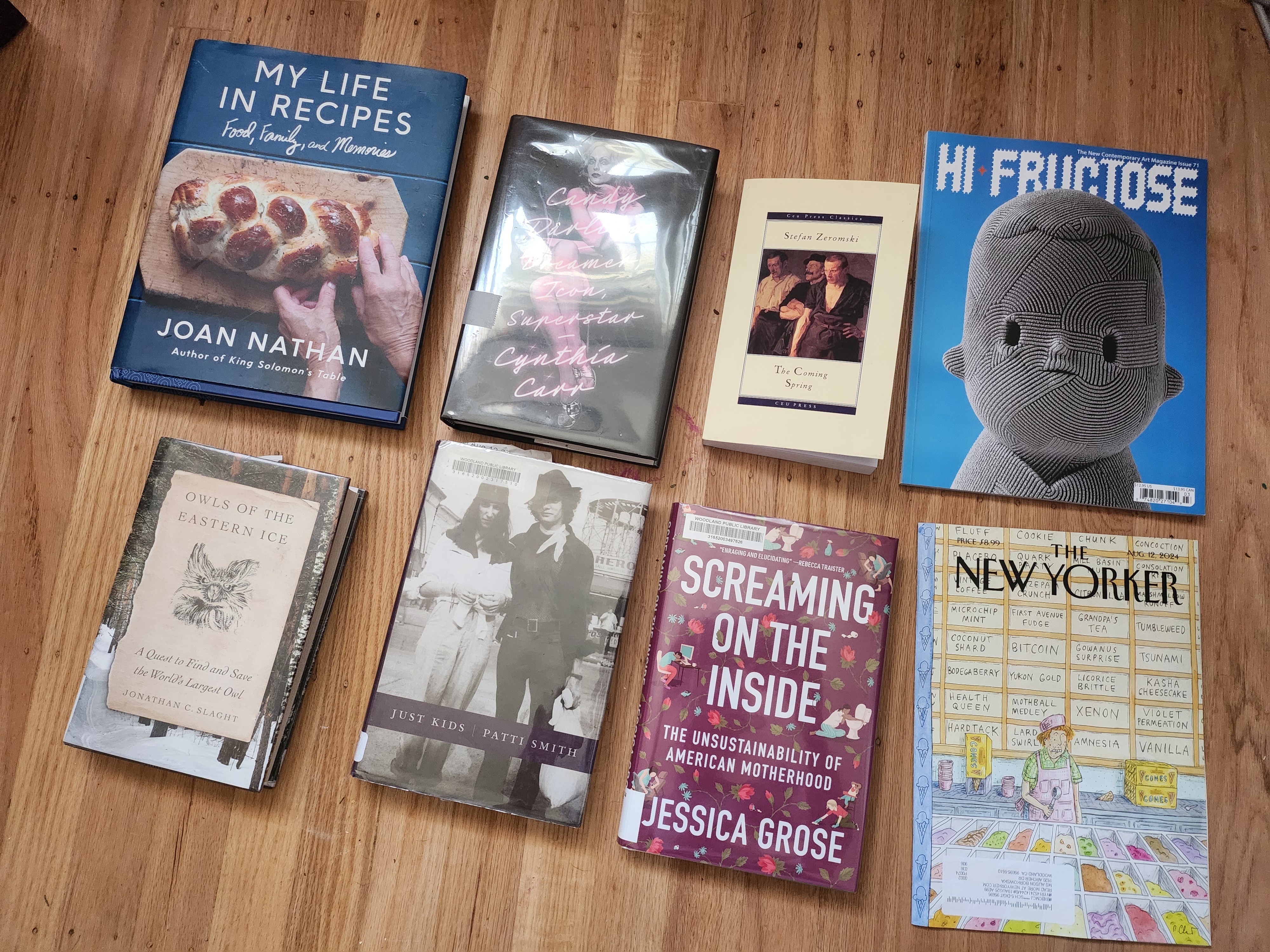 My Life in Recipes is so awesome — you can get it from the library– totally worth reading some of the stories in there amongst the recipes. Candy Darling by Cynthia Carr is the most recent biography about the legendary transwoman extraordinaire, my husband bought me The Coming Spring as the author is a Polish Nobel Laureate, Hi Fructose is fun to look at, Owls of the Eastern Ice came to me from @foshee07 as did Just Kids, Screaming on the Inside – The Unsustainability of American Motherhood is cathartic, and NYer magazine is always good company.